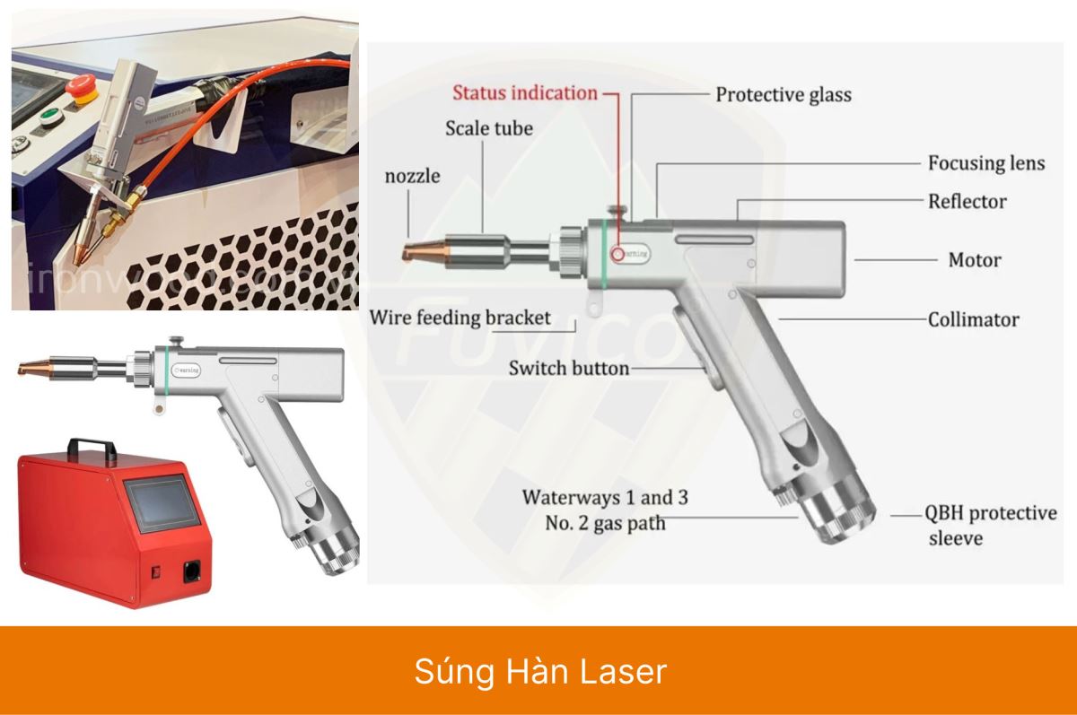 + Máy hàn laser dùng năng lượng tia laser phát ra từ nguồn laser fiber để hàn các vật liệu kim loại với nhau